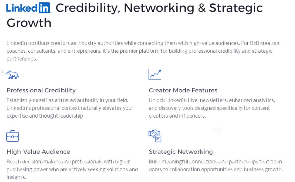 LinkedIn®: Credibility and conversations that convert. Creator Mode, newsletters, and DMs are where relationships and inbound work happen.
